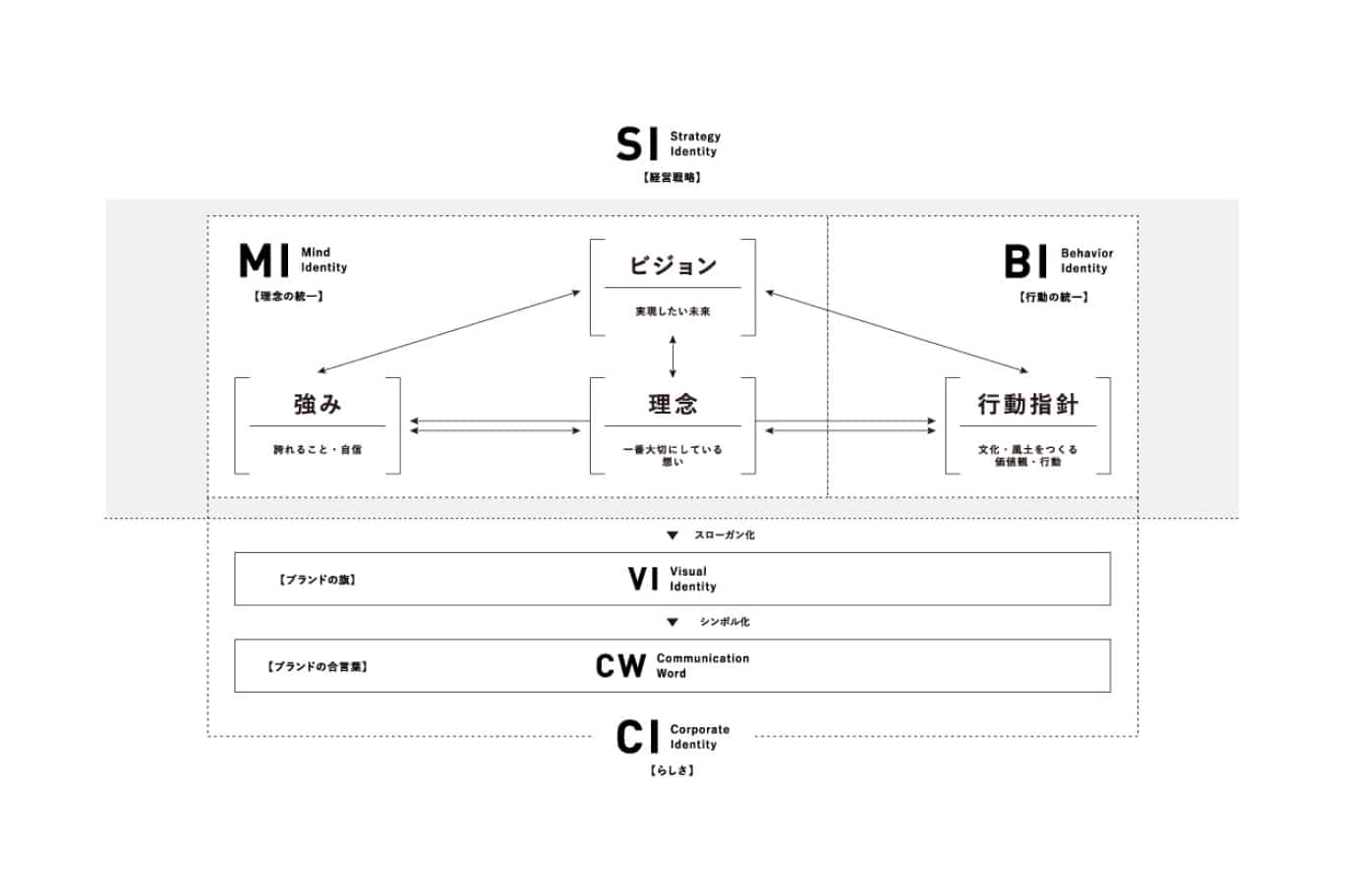 会社の理念や価値などのあり方(MI)やそこに集う社員がどうあるべきかの行動基準(BI)を明確化し、さらにどう分かりやすく伝えるか(VI)を考えてイメージを作ります。